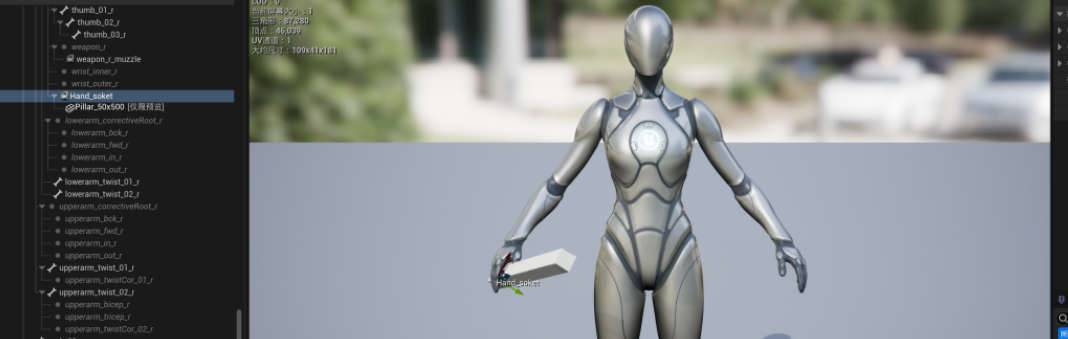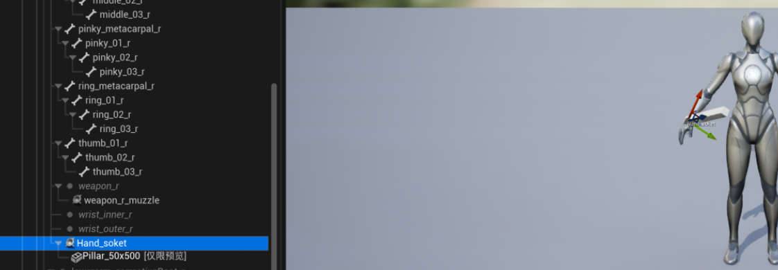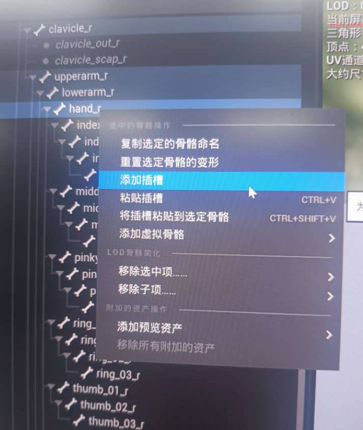 2.在右手骨架找到hand_r骨骼。右键添加插槽
