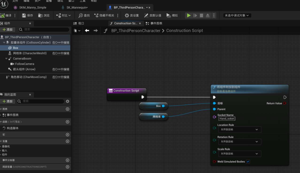 4.在小白人蓝图里如图所示添加组件(静态网格体组件修改名字为Box)、节点;该节点的目标(为你想设置的物件)此处为Box为其设置对应模型,Parent(为物件依赖的基类)此处为小白人模型网格体(CharacterMesh0)。在Socket_Name框中填写之前命名的插槽名(必须一模一样)。